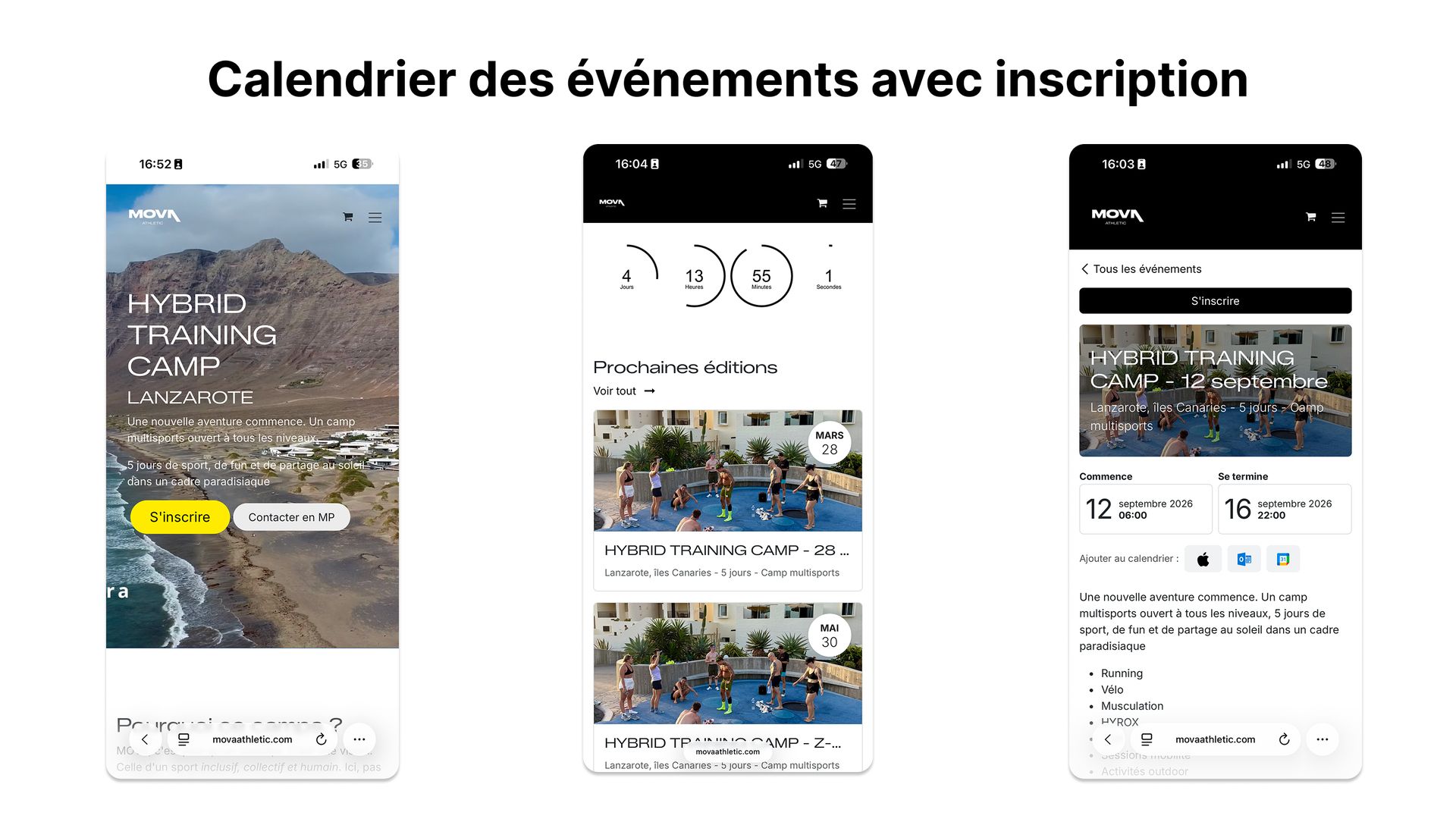 - Calendrier des événements avec compte à rebours, fiches détaillées et bouton d'inscription