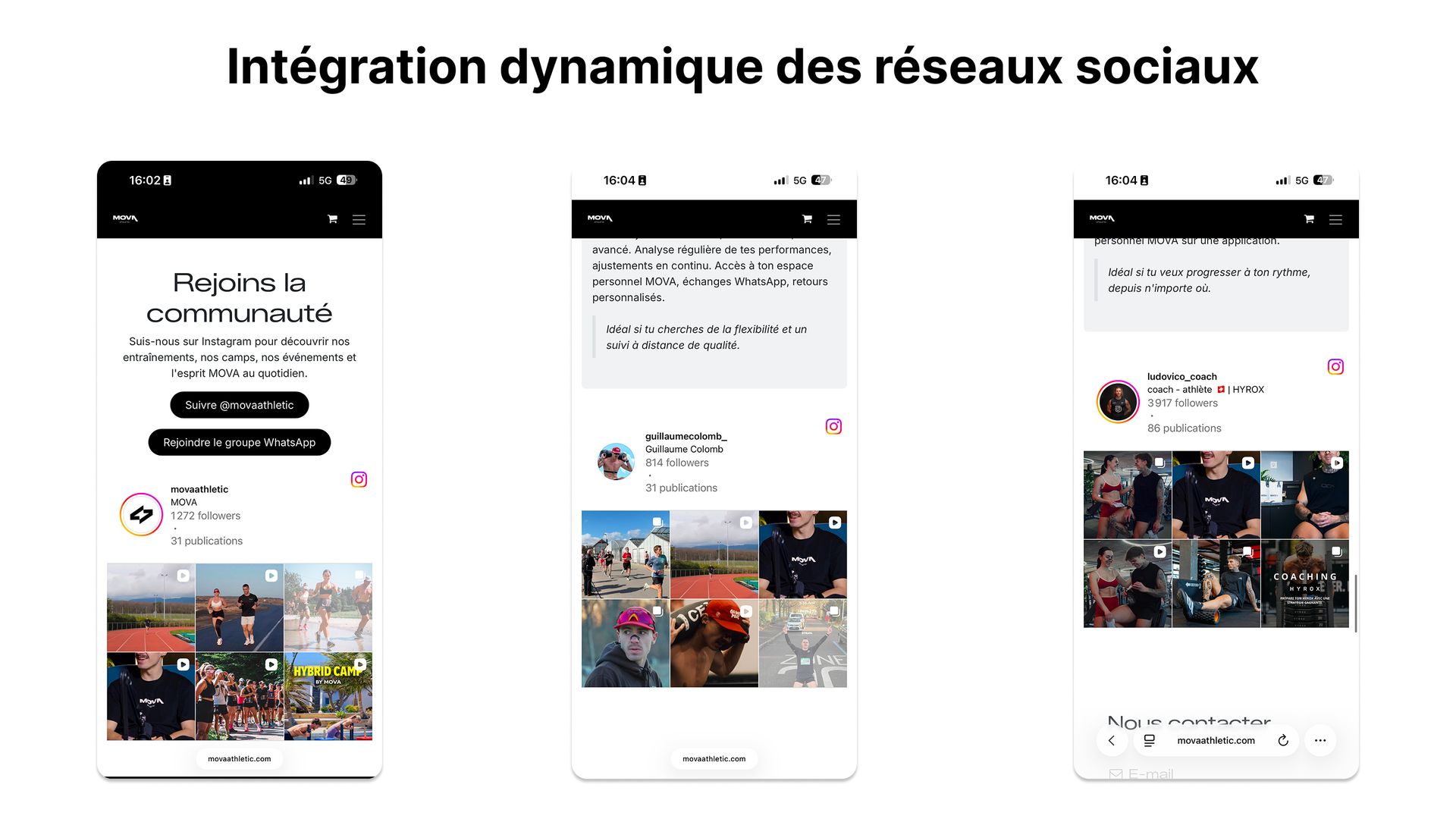 - Intégration dynamique des flux Instagram des trois coachs directement sur le site