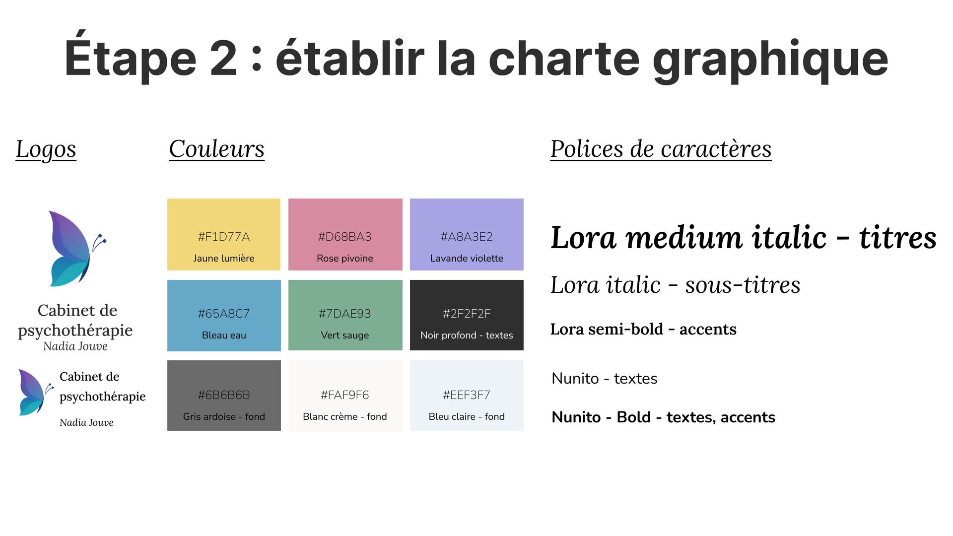 - Création de l'identité visuelle complète : logo papillon, palette de couleurs, typographie (Lora + Nunito)