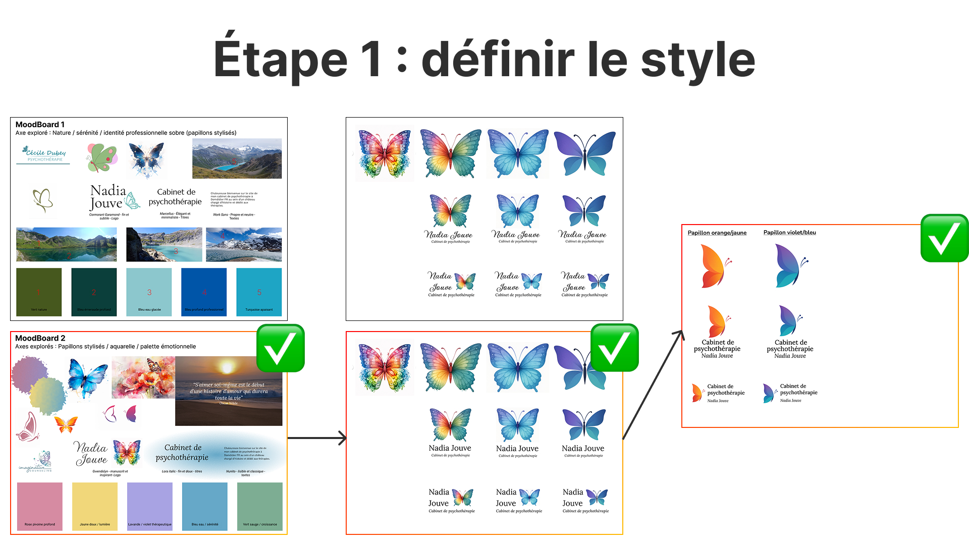 - Deux moodboards proposés pour définir la direction artistique — nature et sérénité vs aquarelle et papillons stylisés